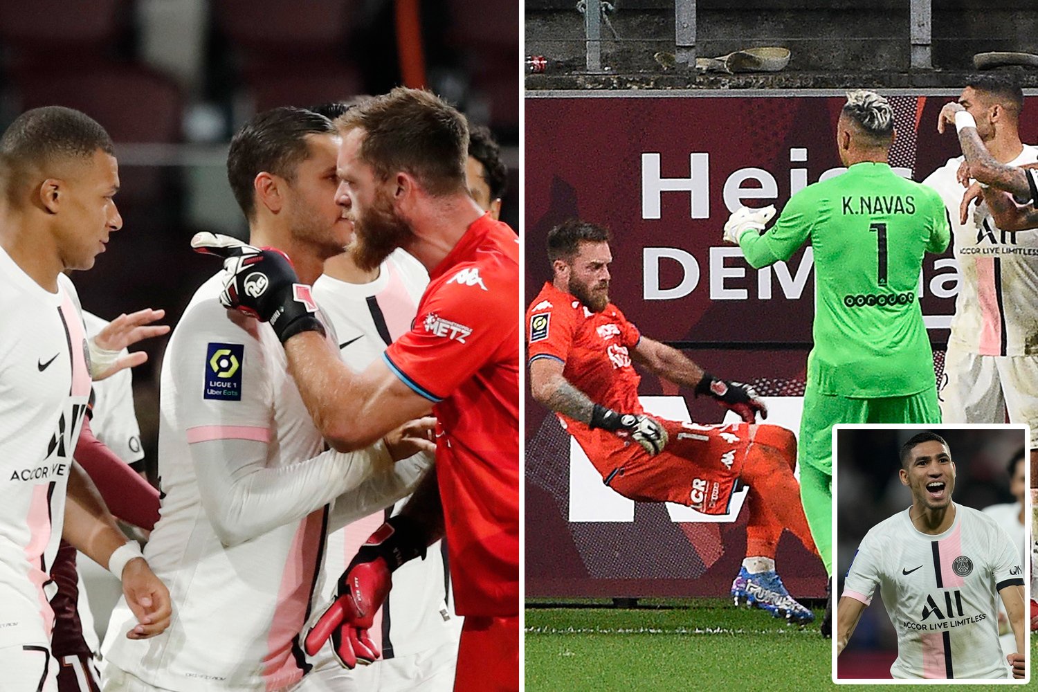 Place Metz - PSG. Donnarumma Mendes Hakimi Kimpembe Marquinos Herrera Gueye Neymar Messi Di Maria Mbappe. Tampoco ingresó al campo cuando los jugadores de PSG fueron unidos de un arco a otro para dedicarle el triunfo a los 47000 espectadores.